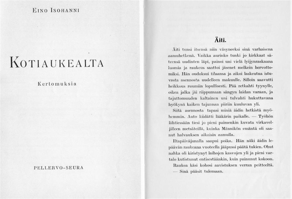 Olen valinnut kirjasta tähän kertomuksen "Äiti", jossa Eino kertoo hyvin kauniilla ja herkällä tavalla käynnistään äitinsä Hilman sairasvuoteen äärellä sekä itsestään että Männistöstä.