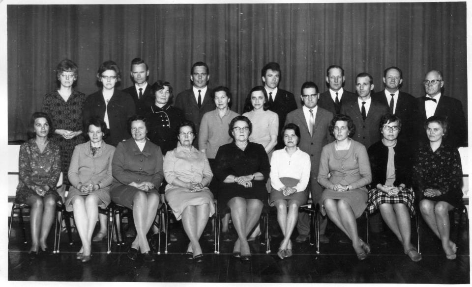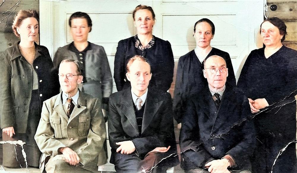 Kannuksen kirkonkylän opettajat 1948: Laina Pirinen, Laina Pajala, Aino Peltola, Vähäkangas, Kestin Manta, Riipinen, Isohanni ja Liukkonen